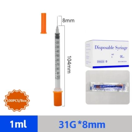 Seringa de segurança de 1 ml com agulha para insulina, vários tamanhos, estéril e embalada individualmente.